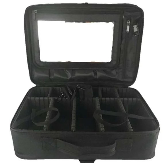 Measuring 16”-inch x 11.5”-inch and 5.5”-inch wide, it’s small enough to take on a plane and carry every day, yet large enough to carry your hair clippers, trimmers, shavers, blades, and accessories. Two inner straps to hold up the inner mirror panel for a comfortable on-site station when you need it.